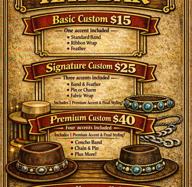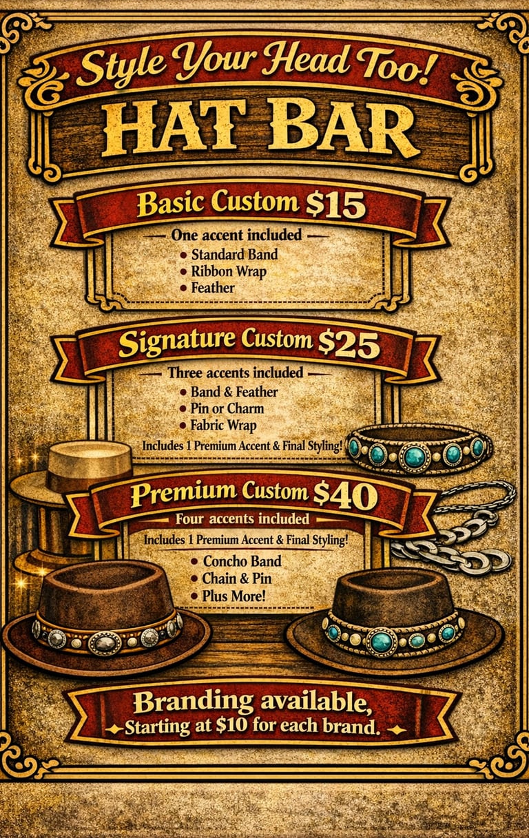 We offer custom hat branding with a large collection of nearly 200 branding irons, giving you plenty of ways to personalize your hat. Our branding options include letters, numbers, punctuation, symbols, and assorted character styles, so we can create initials, names, meaningful dates, simple marks, and custom detail work that gives your hat a more personal finish. Our branding tools are designed for use on hats, felt, leather, and cowhide, which makes them a great fit for one-of-a-kind hat bar creations and custom upgrades