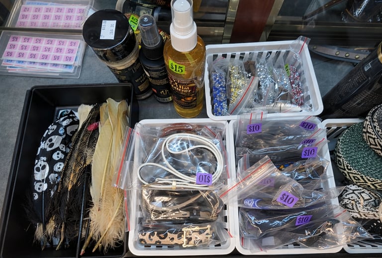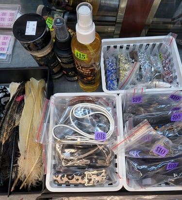 Our Hat Bar lets you create a custom hat with your choice of hat, band, feathers, pins, lace, and other details. We guide you through the design, then professionally shape and finish the hat for the exact look and fit you want.